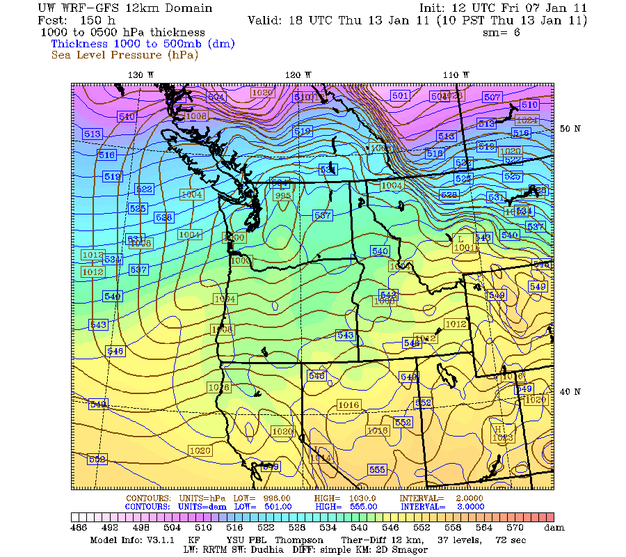 It is important to understand why we might have such a big snow storm, and what ingredients are needed to come together to deliver a potentially historical punch. The scenario shown above is the PERFECT scenario for gobs of snow for Seattle. We have a split jet stream in the upper atmosphere, with one branch coming into our area from Canada and one coming off the Pacific. You can see a developing low pressure system in the far left corner of the picture. This comes onshore just north of Astoria, as evidenced down below.
