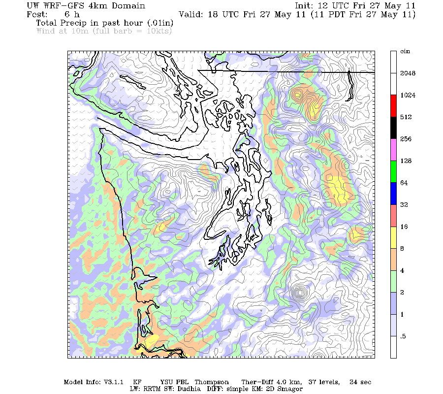 The following diagrams for the forecast at 11 A.M. today and the forecast at 5 P.M. today nicely illustrate the convective showers that are expected to pop up this afternoon, and the graphic at 2 A.M. shows how many of the showers, with a weak convergence zone being an exception, have died away.