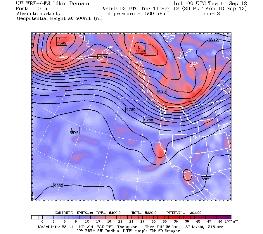 Valid 08:00 pm PDT Mon, 10 Sep 2012 – 3hr Fcst – UW 36km 00z WRF-GFS 500mb absolute vorticity, heights