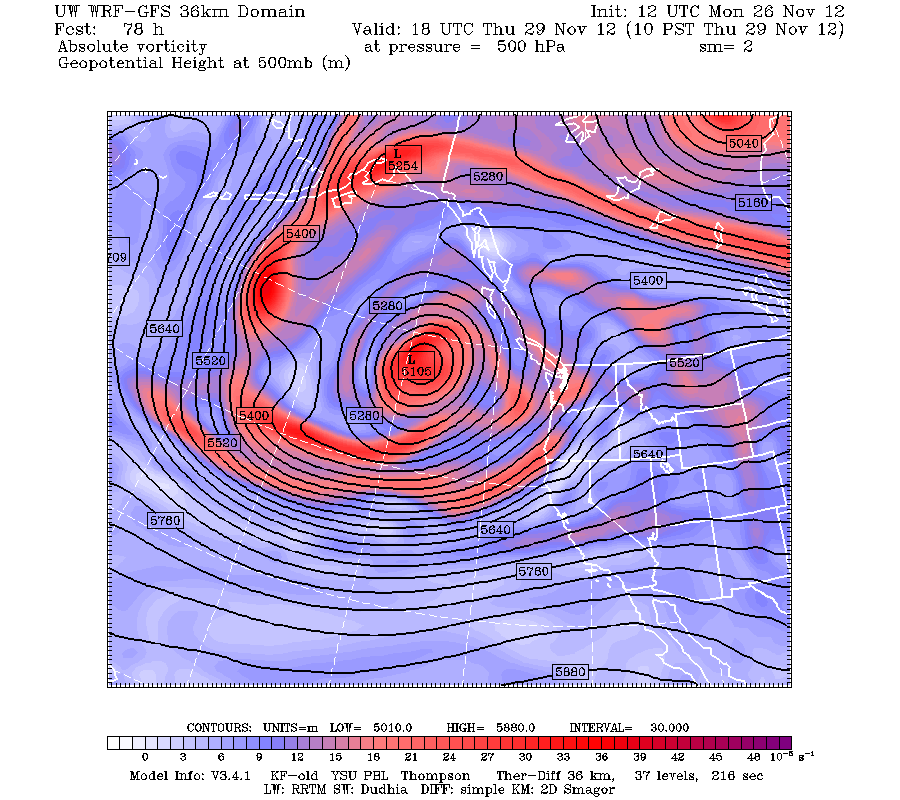Valid 10:00 am PST Thu, 29 Nov 2012 – 78hr Fcst – UW 12z WRF-GFS, 36 km 500mb absolute vorticity, heights