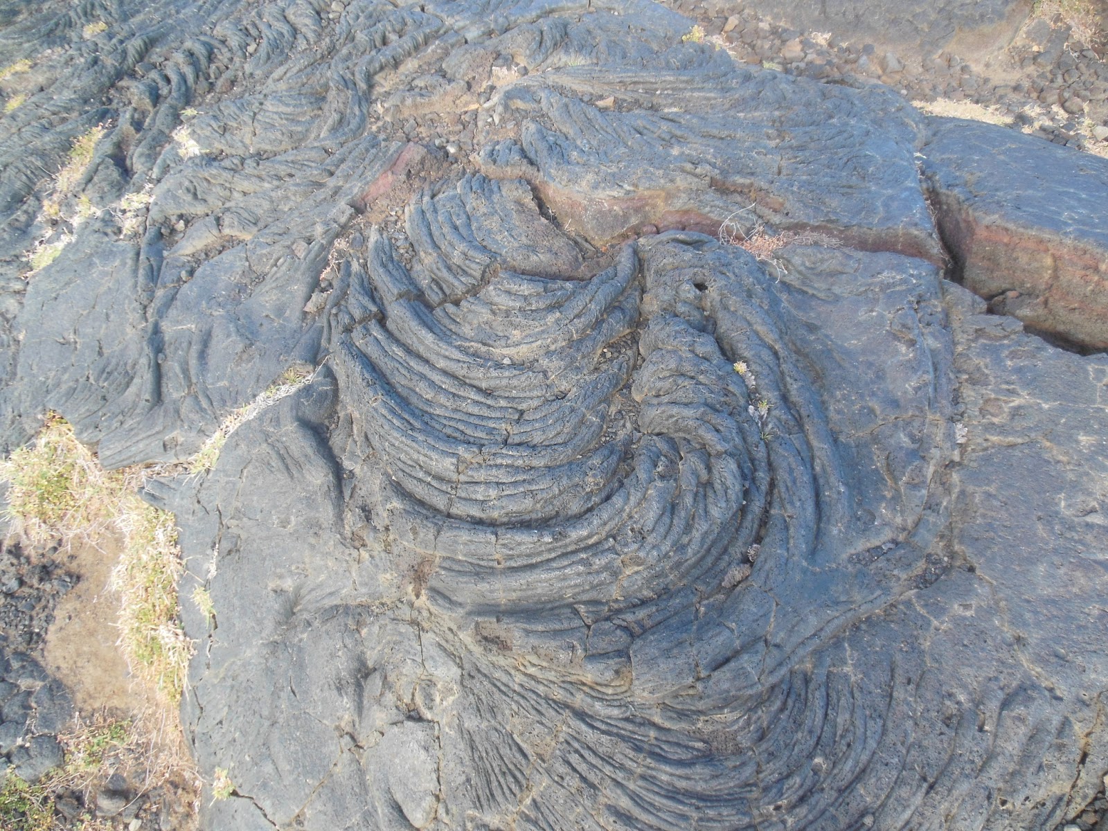 Pahoehoe lava has a smooth surface texture, not unlike that of a pan of chocolate brownies. Additionally, they have little textures on them that provide a glimpse into how the lava cooled into solid basalt. Check out the pictures I took at the end of Chain of Craters road by the ocean.