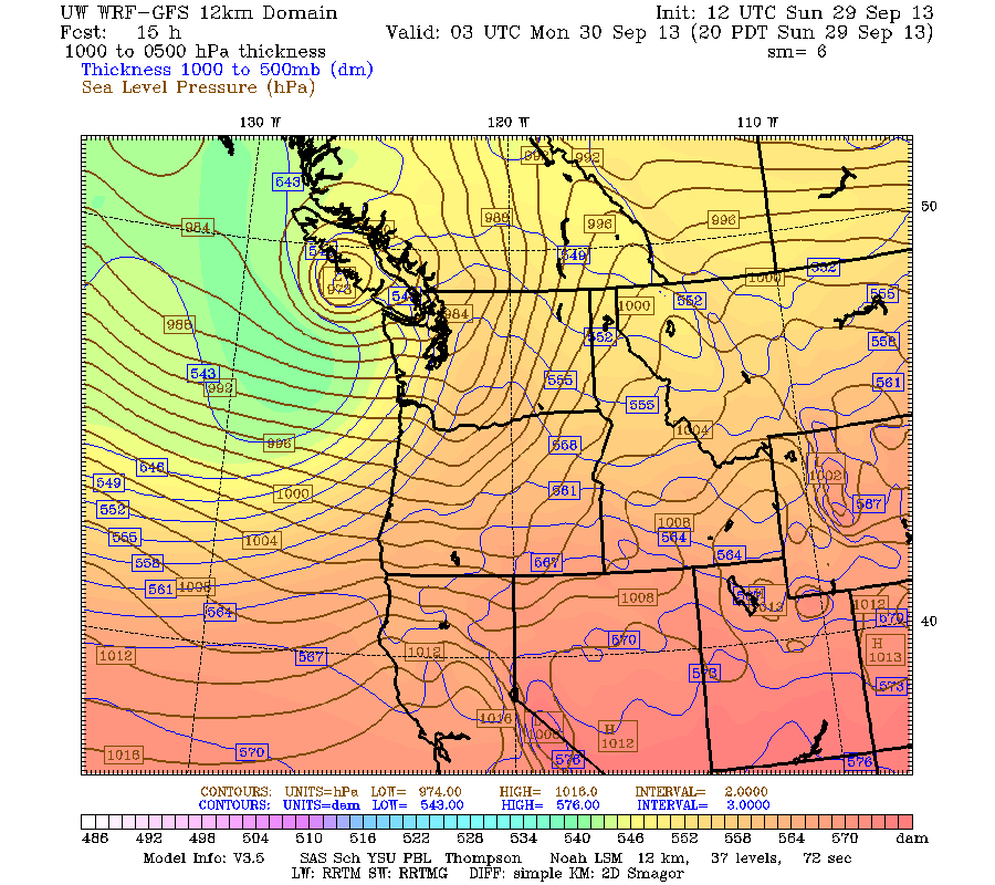 The 12z WRF-GFS is about on par with what we saw last night… maybe a wee bit weaker. This sort of track would give storm force winds to the coast with lesser gales inland. Of course, gales are nothing to snicker at, but we aren’t talking any record winds here. The gradients are not nearly tight enough over our area. The place that has the best shot of receiving some damaging winds would be Clayoquot Sound and Tofino.