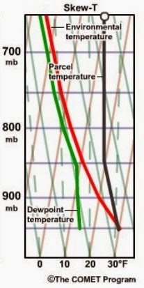 Convection feeds on the potential energy inherent in the temperature in the moisture stratification, and this potential energy is known affectionately by the meteorological community as CAPE (Convective Available Potential Energy) and is in J/kg.