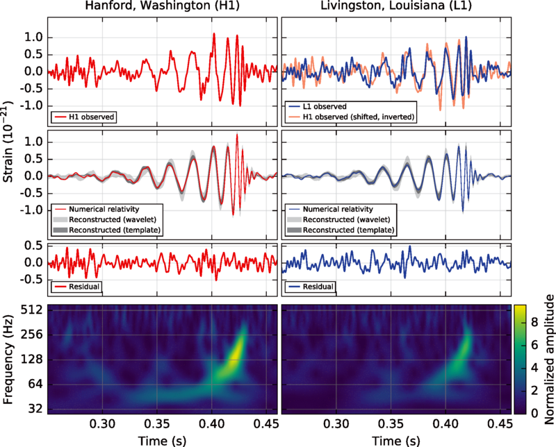 The change in arm length is on the small side – typical changes are on the order of 1/10,000th the width of a proton! Incredibly, the interferometers are sensitive enough to measure this change. I don’t know how they do it. To determine whether the readings were due to gravitational waves and not – say – a 9.0 Cascadia Subduction Zone earthquake, scientists are on the lookout for specific patterns that suggest the passing of a gravitational wave. Here are their exact measurements from the gravitational wave everybody is talking about.