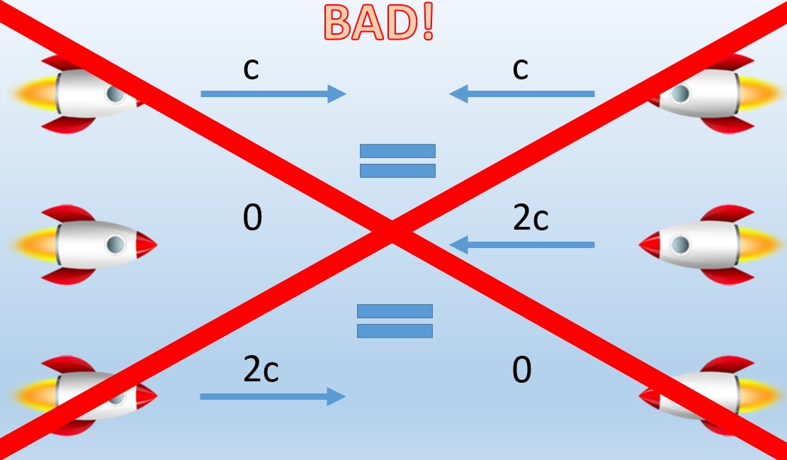 Weird things happen when you travel at speeds close to the speed of light. Say, for example, that I am flying in a spaceship at the speed of light to the east, and my buddy is flying at the speed of light to the west. It would seem, then, that from my inertial reference frame, my buddy is traveling at two times the speed of light away from me. In the graphic below, ‘c’ stands for the speed of light, while ‘2c’ stands for twice the speed of light.