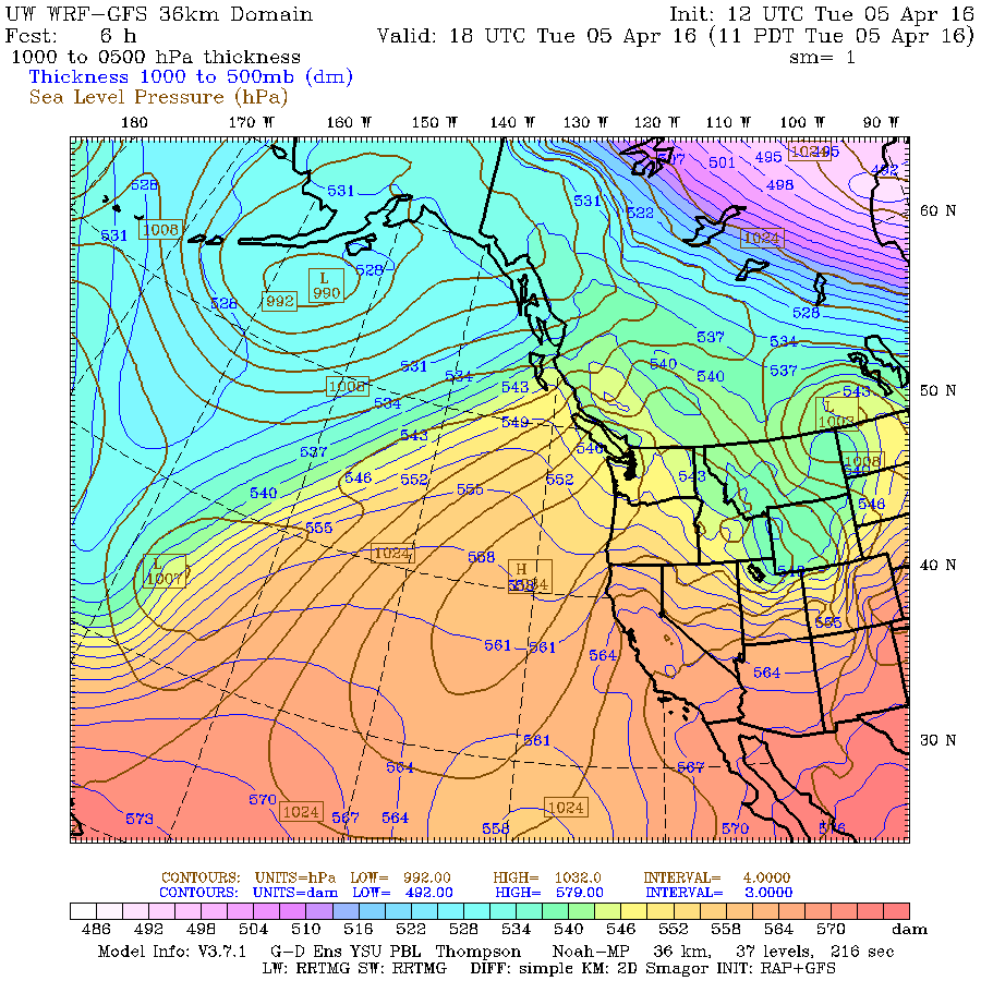 Here’s what the thicknesses are like over the West Coast around 11 am this morning. As you can see, we have a ridge to our south with relatively high thicknesses over the area, but in order to get into the 70s, you’d want that ridge to become stronger and you’d want thicknesses to be in the 560s or higher.