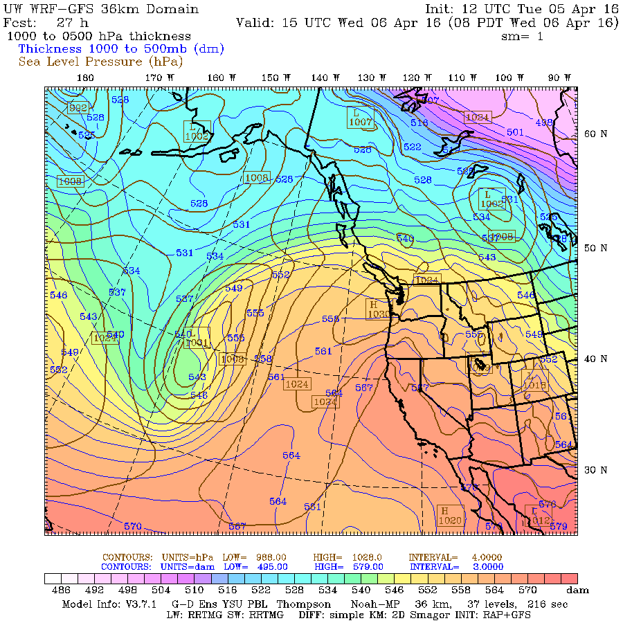 Let’s take a look at the WRF-GFS 1000-500 hPa thickness chart. I love this chart because it does a great job of quickly showing which areas are expected to be warm and which areas are expected to be cool. This is because “thickness” between two pressure levels is a function of density, and the less dense the air, the higher the thickness.