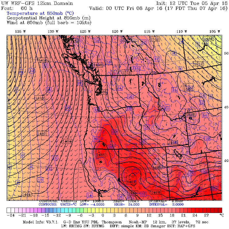 The 850 mb temperatures at 5 pm Thursday are forecast to be 16-17 degrees Celsius, which would set a new record not only for April 4th but for all of February and March as well, and possibly even January and April. Needless to say, it will be extremely warm in the upper atmosphere, and that warmth will make its way down to the surface.