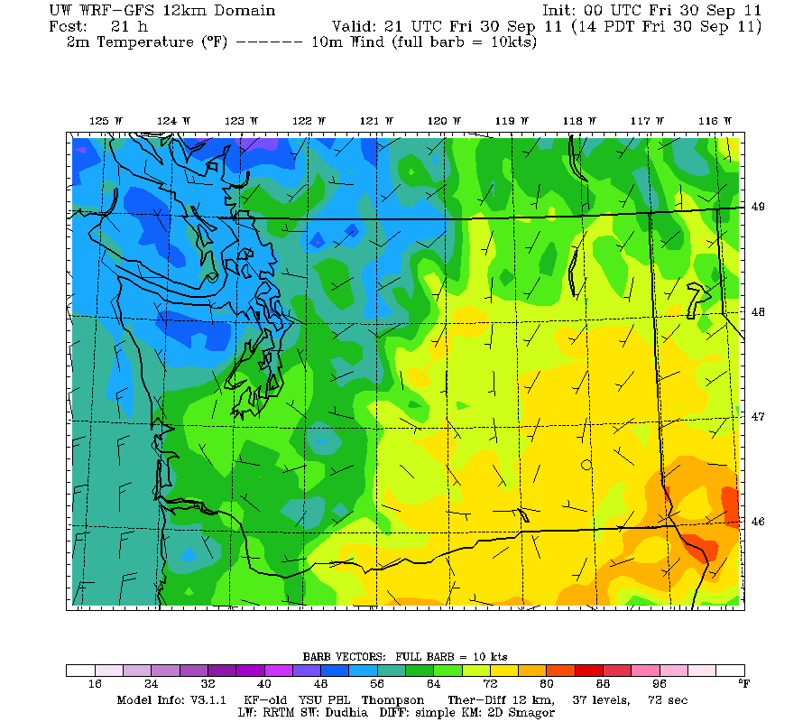 Valid 02:00 pm PDT Fri, 30 Sep 2011 – 21hr Fcst – UW 4/3km 00z WRF-GFS 2-meter temp