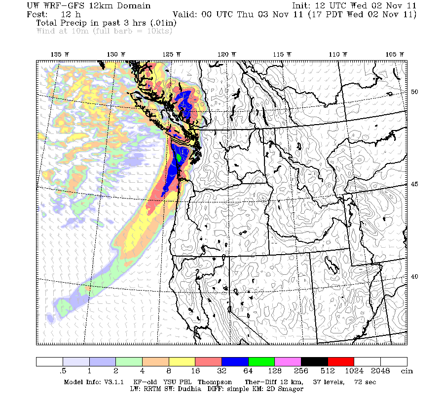 Valid 05:00 pm PDT Wed, 02 Nov 2011 – 12hr Fcst – UW 12km 12z WRF-GFS 3-hour precip