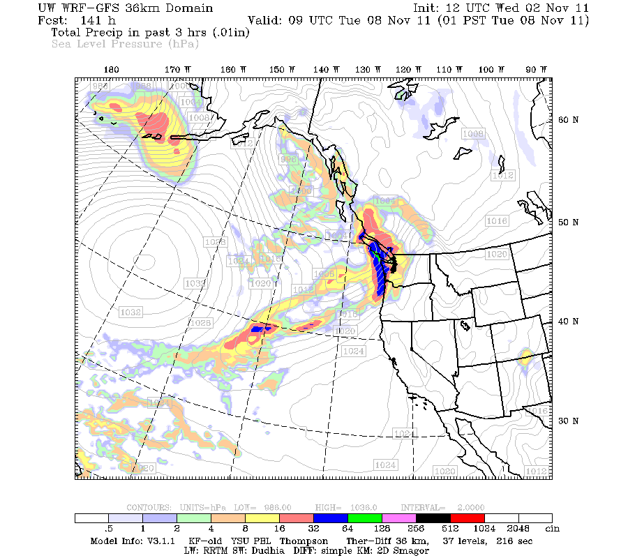 Valid 01:00 am PST Tue, 08 Nov 2011 – 141hr Fcst – UW 36km 12z WRF-GFS 3-hour precip