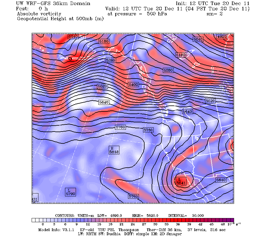 Valid 04:00 am PST Tue, 20 Dec 2011 – UW WRF-GFS 12z 36km 500mb vorticity, heights