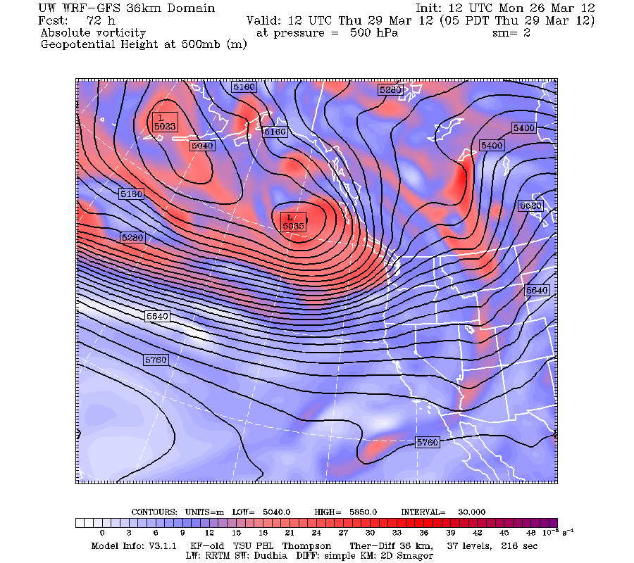 Valid 05:00 am PDT Thu, 29 Mar 2012 – 72hr Fcst – UW 36km 12z WRF-GFS 500mb vorticity, heights