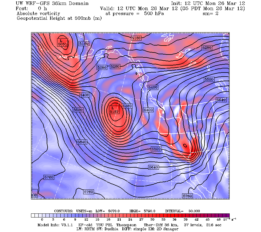 Valid 05:00 am PDT Mon, 26 Mar 2012 – UW 36km 12z WRF-GFS 500mb vorticity, heights