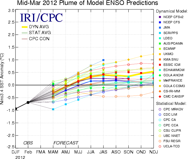 And finally, here’s a picture of some model forecasts the Nino 3.4 region SST anomalies over the next year or so. The forecast is a little old, but you can clearly see a transition to a neutral phase, with temperatures ever so slightly above average.