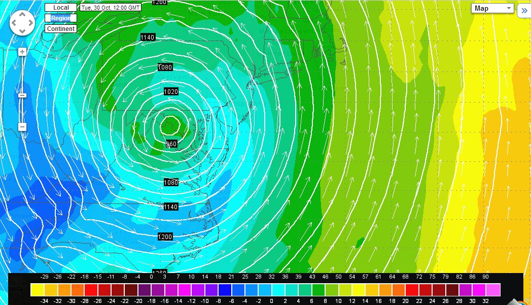 Disclaimer: I got the idea of showing these pictures from Cliff Mass’ blog, because I thought he did a good job at explaining it. These are not the exact same pictures and aren’t even from the same model run. These are from the Monday, October 29 12z HWRF model and are the charts at 850 mb. They show the geopotential heights (contours, 30m interval), temperatures (color fill, 2 Celsius interval), and wind vectors (m/s).
