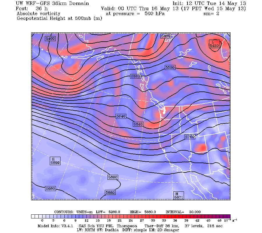 | Valid 05:00 pm PDT, Wed 15 May 2013 – 36hr Fcst: UW 12z WRF-GFS: 36km 500mb Absolute Vorticity, Heights |