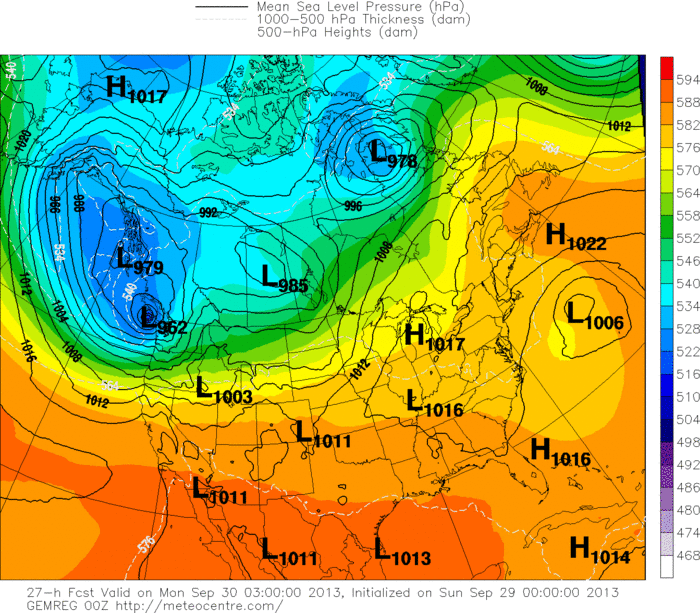 | Valid 05:00 pm PDT, Sun 29 Sep 2013 – 36hr Fcst: temperature at 925 mb (C), SLP (hPa), 10-meter wind speed (knots). UW WRF-GFS 12km Resolution: Initialized 12z Sat 28 Sep 2013. Retrieved from the (University of Washington) Pacific Northwest Environmental Forecasts and Observations website. Chart URL: http://www.atmos.washington.edu/~ovens/wxloop.cgi?mm5d2_slp+2013092900//84/3 |