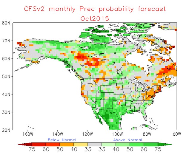 September is halfway complete, so we don’t need to use El Niño to try and predict what you should wear on Wednesday (you should wear a raincoat!). The models are painting a cool and rainy scenario for us the next two weeks… the above forecast provides evidence of that for this upcoming week, and the graphic below shows that we are expected to see below-normal temperatures and above-normal precipitation next week as well.