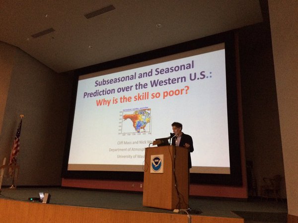 | Cliff Mass at the 2016 Pacific Northwest Weather Workshop talking about how bad our seasonal precipitation forecasts were this year. Credit: Logan Johnson |