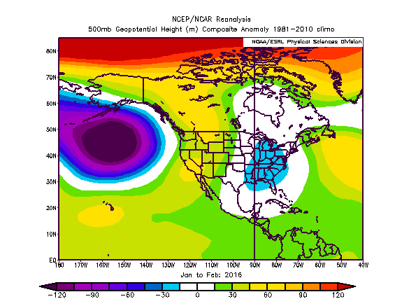 El Ninos generally give wetter-than-normal conditions to California after the New Year (there is little correlation before January 1st), and this is due to a large area of low pressure setting up in the Eastern Pacific, allowing the jet stream to sag southward into California. We had a wet October and November and a downright stormy December, and while an El Nino pattern did develop after the New Year, there was also a persistent ridge of high pressure over Southern California, pushing the jet stream back north into our region for extended periods of time and giving us relatively warm and wet southwesterly flow in the process. In the graphic below, the negative anomalies correspond to areas of lower pressure and vise versa.